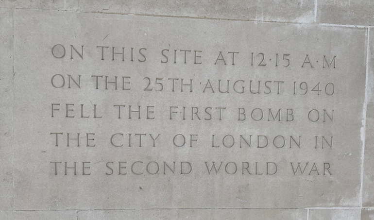 Plaque on Fore Street identifying the site of the first WW2 bomb in the centre of London. Photo Credit: © Ruth Polling.